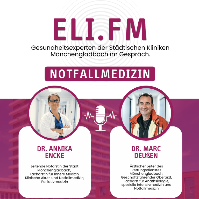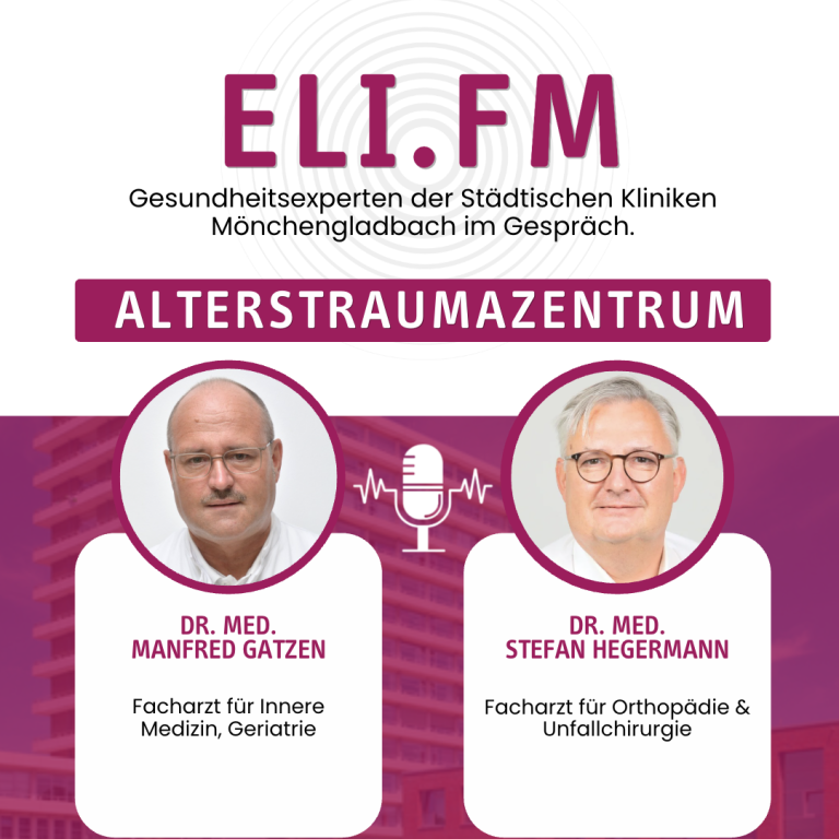 Ein Sturz kann für ältere Menschen weitreichende Folgen haben. Doch was braucht es, damit Patientinnen und Patienten nach einem Unfall schnell wieder mobil werden und ihre Selbstständigkeit behalten? In der aktuellen Folge von ELI.FM sprechen Ltd. Oberarzt Dr. Dr. med. Manfred Gatzen, Facharzt für Innere Medizin und Geriatrie, und Ltd. Oberarzt Dr. med. Stefan Hegermann, Facharzt für Orthopädie und Unfallchirurgie, über das AltersTraumaZentrum der Städtischen Kliniken Mönchengladbach. Sie geben Einblicke in die enge interdisziplinäre Zusammenarbeit und zeigen, warum frühe Mobilisierung und ganzheitliche Behandlung entscheidend für die Lebensqualität älterer Menschen sind.
