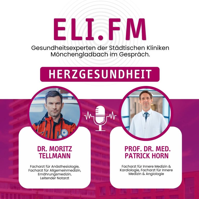 Die Gefahr, an einem Herz-Kreislauf-Leiden zu erkranken, wird durch verschiedene Risikofaktoren erhöht. Was sind die größten Risiken? Welche sind Symptome für eine Herzschwäche oder eine Erkrankung der Herzkranzgefäße? Was ist der beste Sport, um das Herz gesund zu halten? Und welche Rolle spielt unsere Muskulatur und auch die Ernährung dabei? Prof. Dr. Patrick Horn, Chefarzt der Klinik für Kardiologie und Angiologie und Dr. Moritz Tellmann, Oberarzt Anästhesie und Intensivmedizin in den Städtischen Kliniken Mönchengladbach geben Ihnen Antworten.